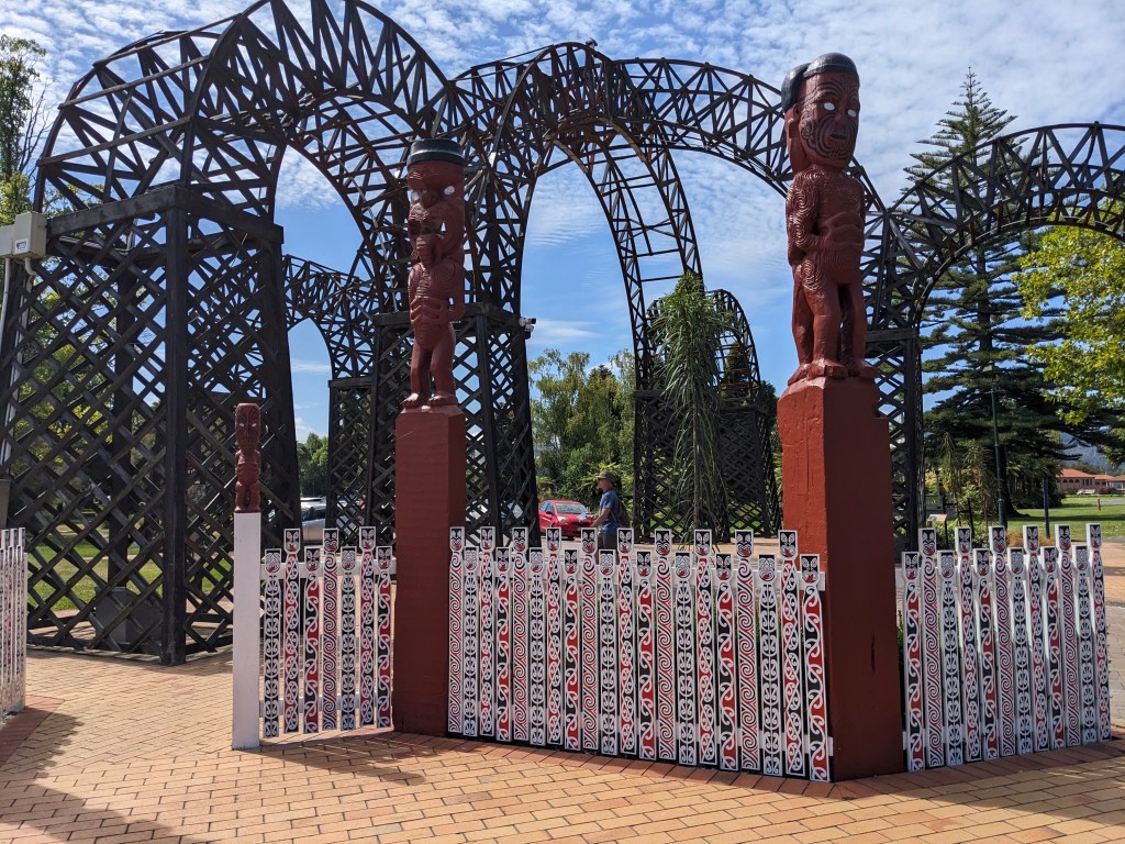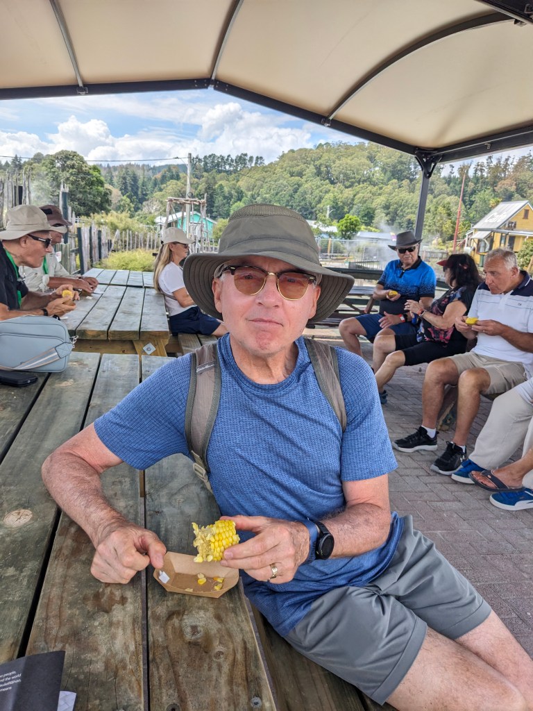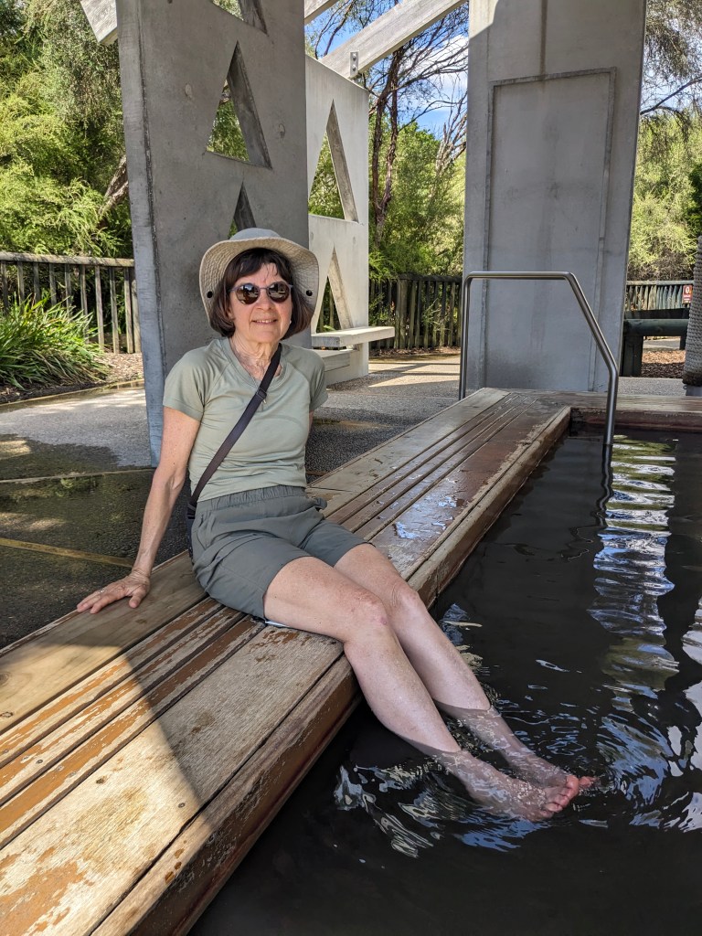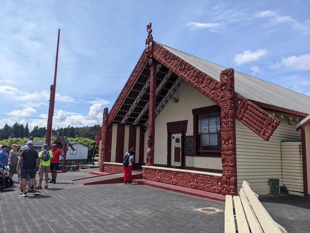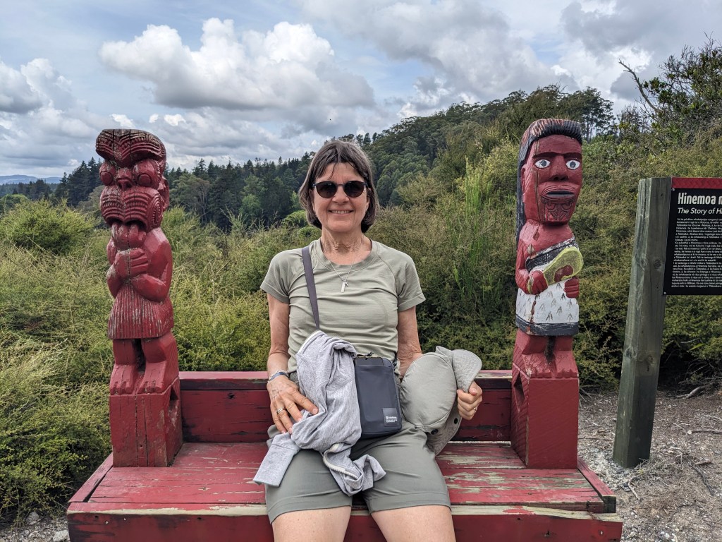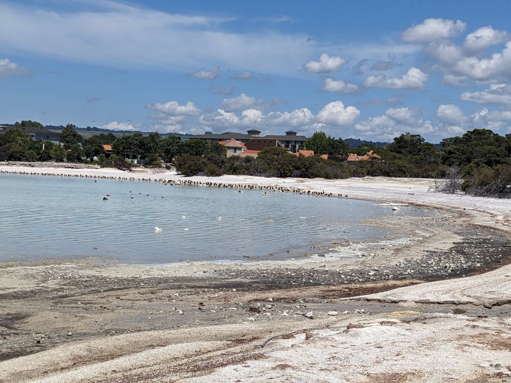 The following day we went into the centre of Rotorua by the lake, which is actually a caldera with an island in the middle. There are many active geothermal sites around the shore of the lake and close to where people are living. There’s another Maori village there as well, Ohinemutu, although not set up for tourists like Whakarewarewa. We walked along the shore of the lake through more geothermal sites where the sulphur smell is quite strong, although you get used to it. There are clear alkaline and murky acidic pools as well as boiling mud pools. There was one park with small pools where you could safely wade or soak your feet although it was quite warm, definitely warmer than our hot tub at home.