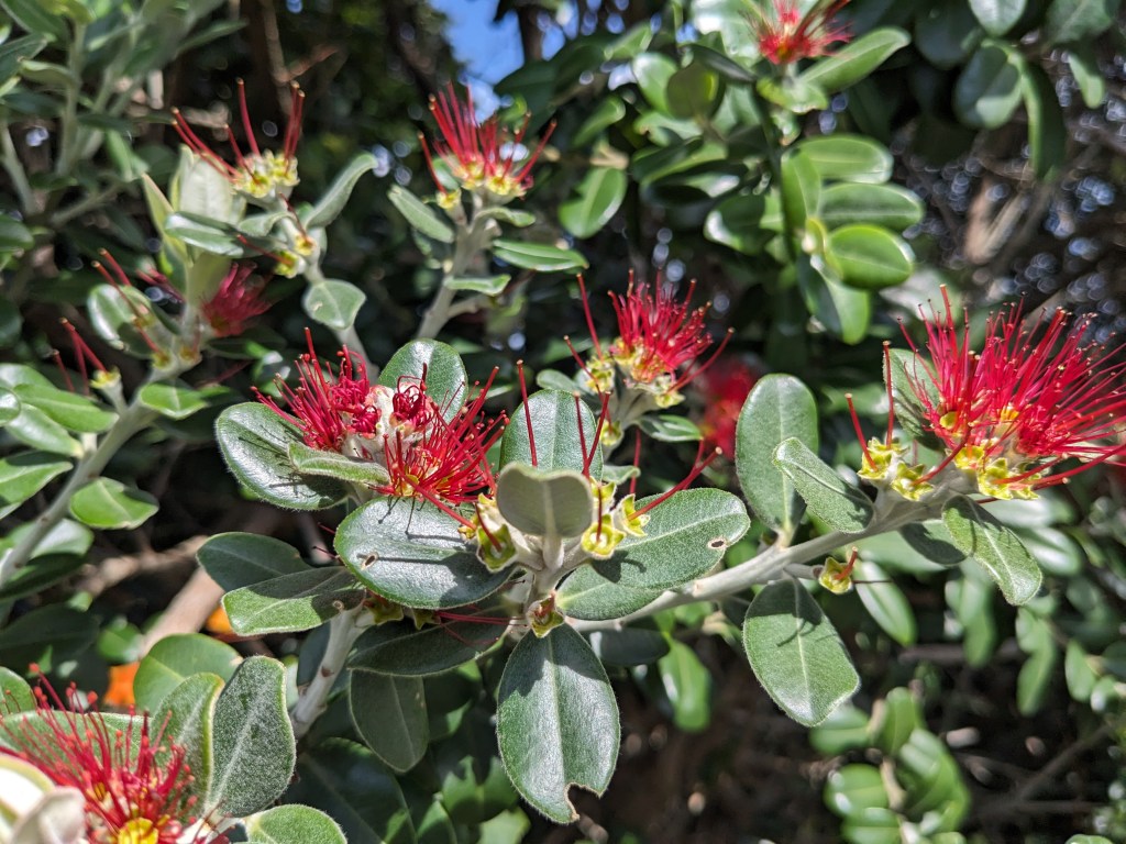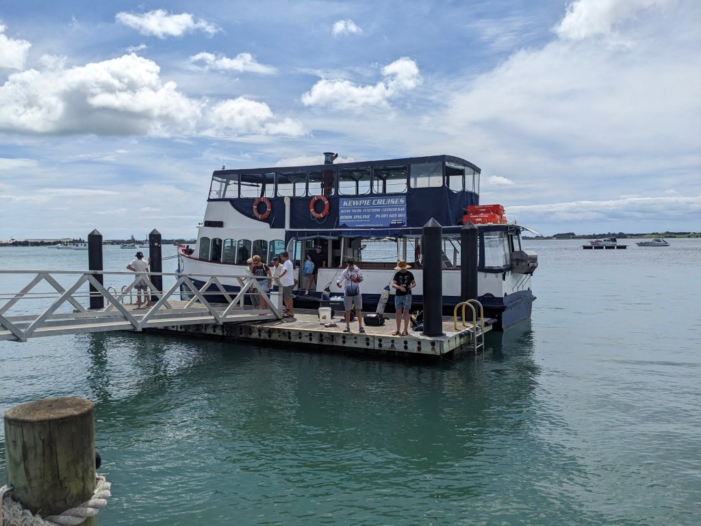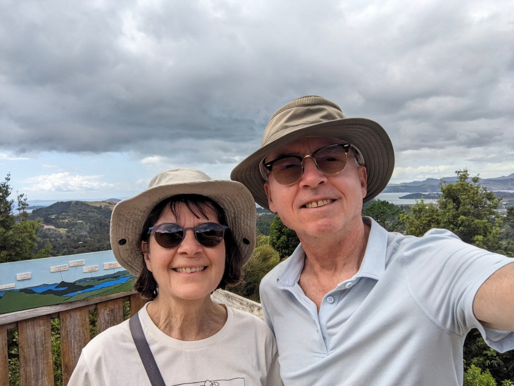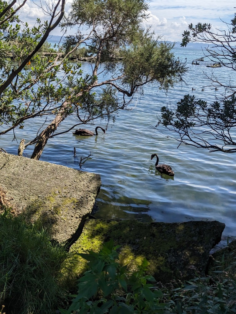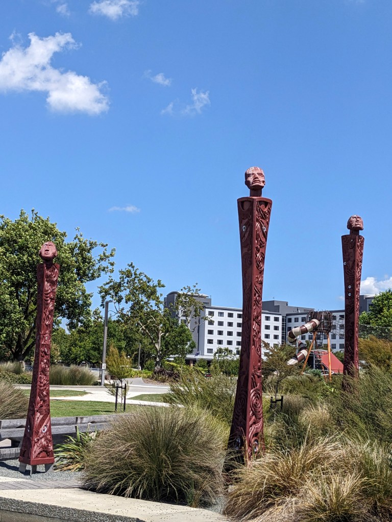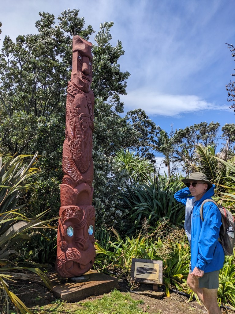 The following day we went into the centre of Rotorua by the lake, which is actually a caldera with an island in the middle. There are many active geothermal sites around the shore of the lake and close to where people are living. There’s another Maori village there as well, Ohinemutu, although not set up for tourists like Whakarewarewa. We walked along the shore of the lake through more geothermal sites where the sulphur smell is quite strong, although you get used to it. There are clear alkaline and murky acidic pools as well as boiling mud pools. There was one park with small pools where you could safely wade or soak your feet although it was quite warm, definitely warmer than our hot tub at home.