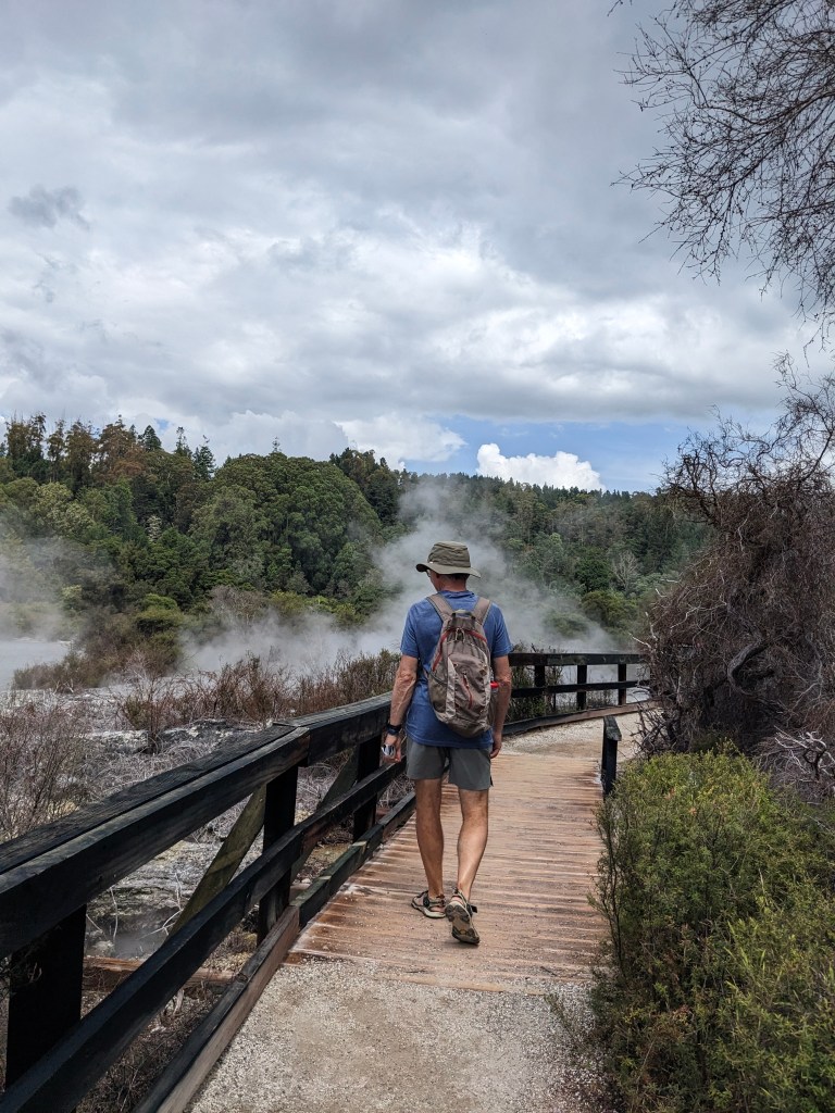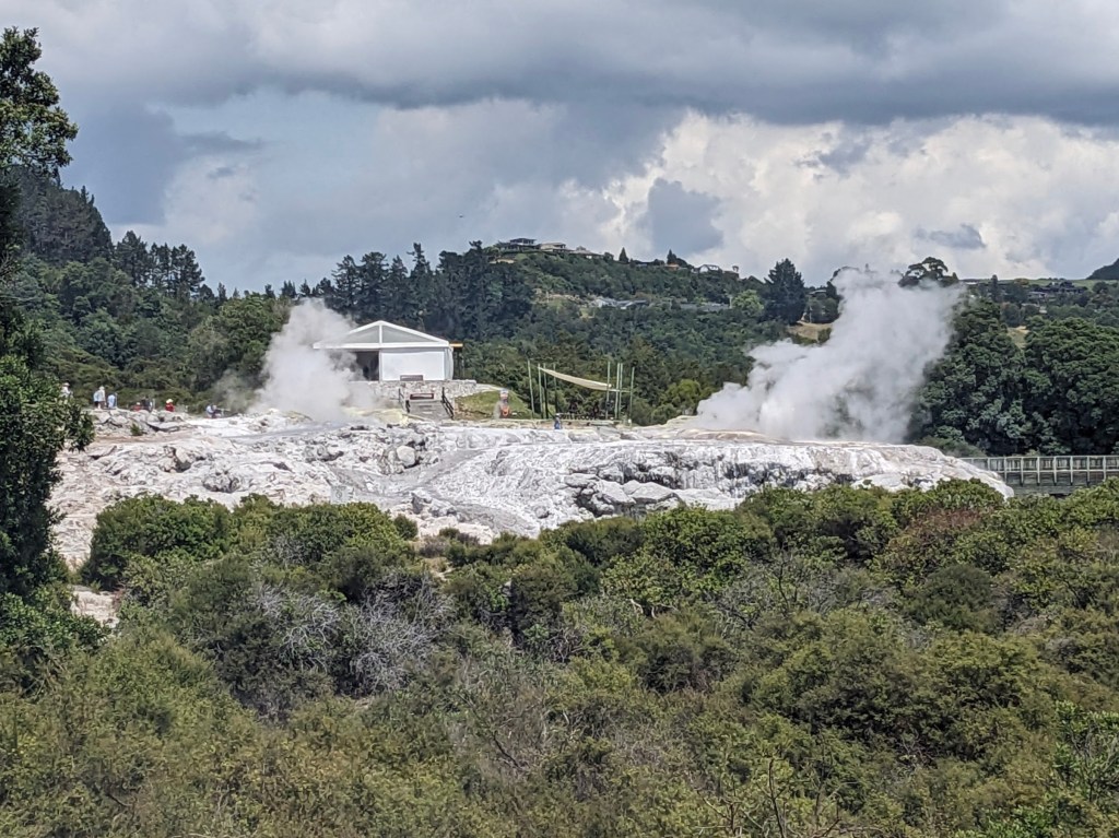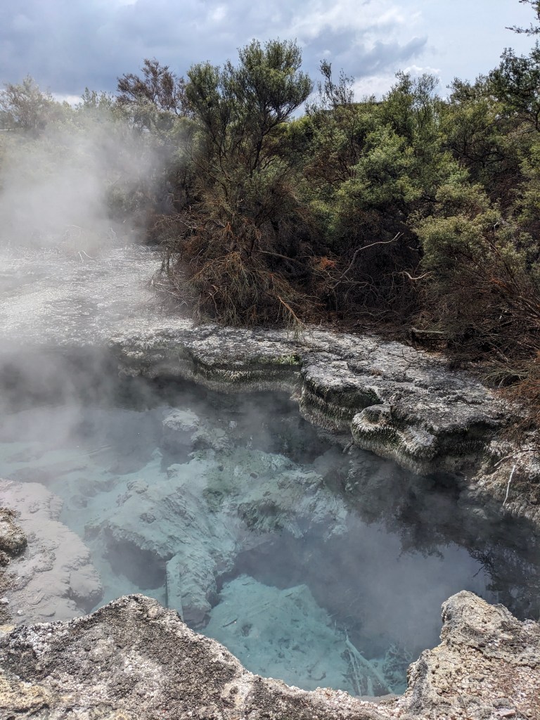 Rotorua is a big tourist destination due to the geothermal attractions as well as the Maori cultural sites. During our stay it wasn’t overly busy though, no trouble getting accommodations or seeing the sites. On our first day we visited Whakarewarewa village, just a short walk from our lodgings. This is an actual Maori village with people residing there still and it is on top of a very active geothermal site. We attended a cultural performance and had a tour of the village, learning about life on a constantly changing and dynamic earth where sometimes vents blow through homes but also how they use the heat and energy to cook and clean themselves. It was a fascinating and steamy environment to walk around. The water is very hot, often at a boiling temperature, so you don’t go swimming here. Where they bathe is cooler, only 45-50 degrees C, still pretty hot.