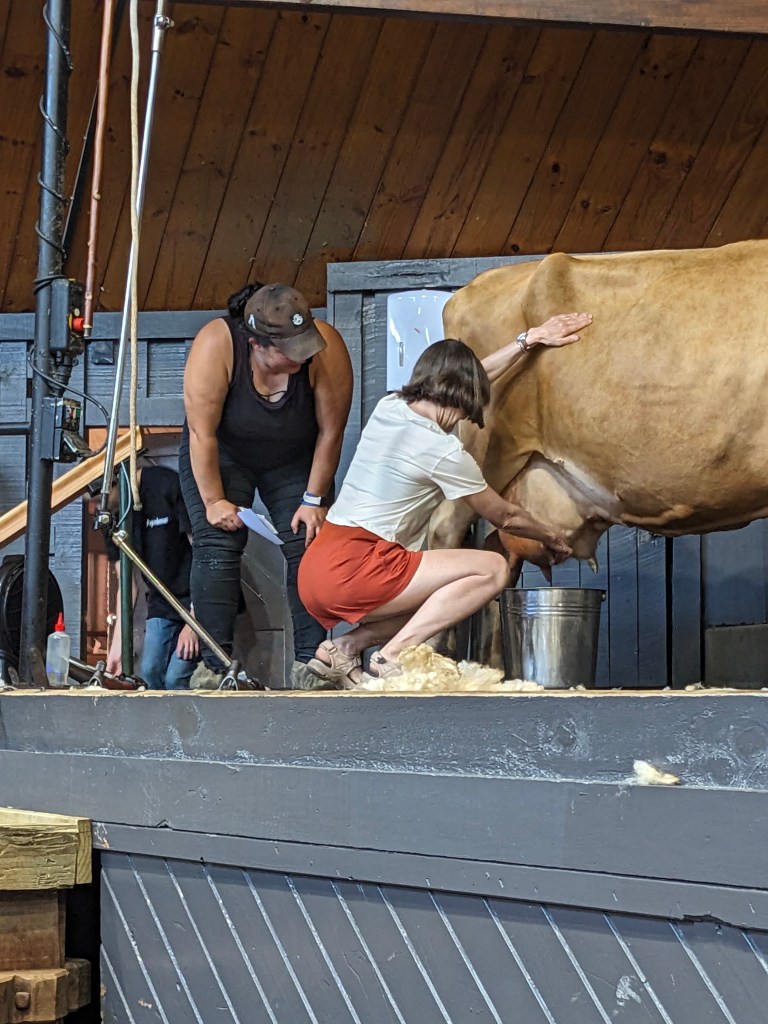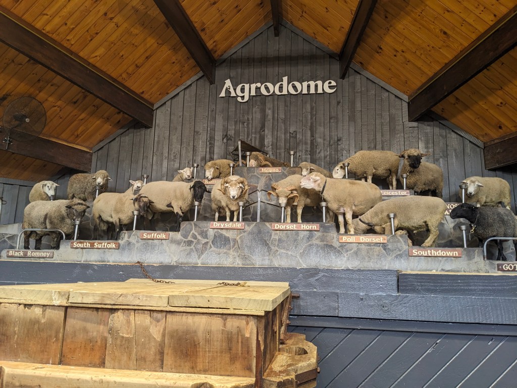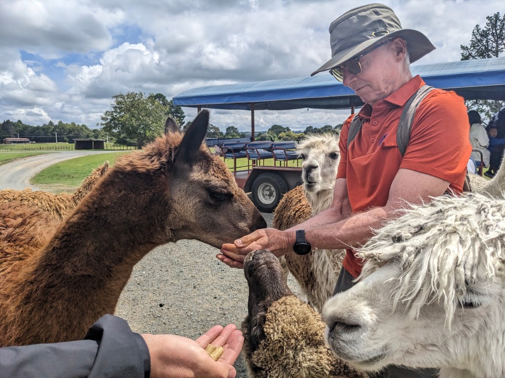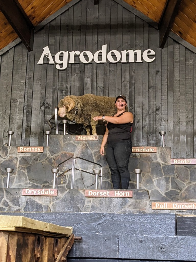 On our final day in Rotorua we took a city bus out to the Agrodome. This is a tourist farm, also an actual working farm, that George visited many years ago on one of his other trips to New Zealand. We saw a farm show that displayed and explained to us the various kinds of sheep, sheep shearing, about the different wool and grades, sheep herding with dogs, cow milking, and a trip around the farm via tractor to see all the animals such as deer, alpaca, cattle and more sheep. It was quite entertaining and Tara had a go at milking a cow.