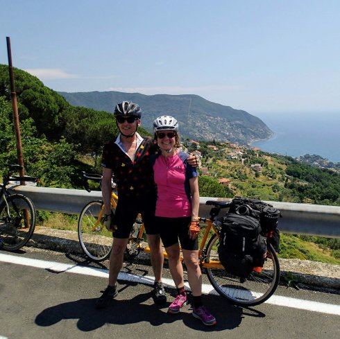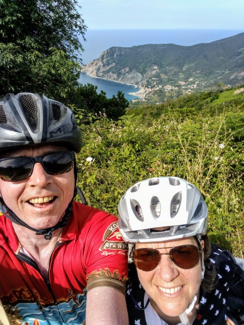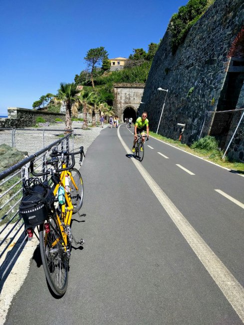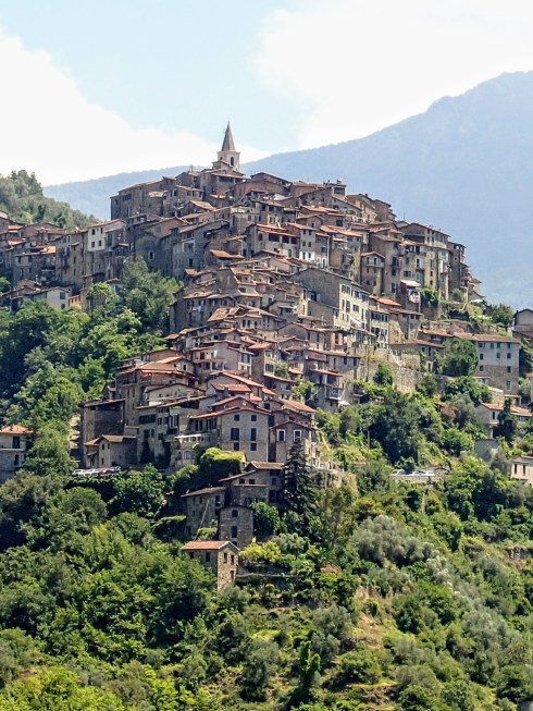 The ride today took us into the Nervia and Crosia Valleys, starting in Ventimiglia. These 3 towns are all classified as “Borgo Più Bello d’Italia or most beautiful towns in Italy. They are medieval with castles and churches, situated on top of hills/mountains with narrow streets and much character. The whole ride was only around 40 kms but again involved some fairly serious climbing, about 500 meters, so took most of the day. We stopped in the 1st town, Dolceacqua, to wander around the old city and do a bit of souvenir shopping. There is a famous old bridge going into the city that was built in the 15th century and was painted by Monet.