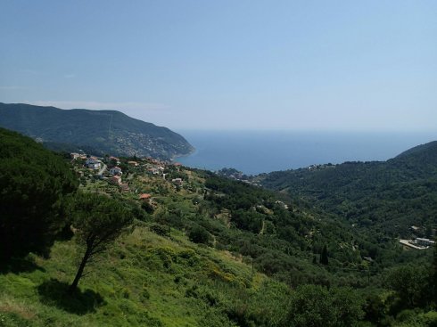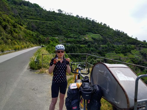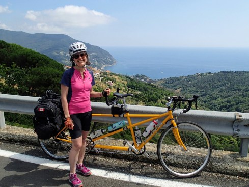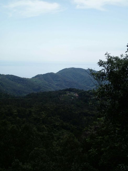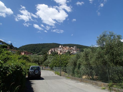 The towns kept getting higher in elevation as we progressed. At one point just before reaching Apricale we saw another town perched high above us and joked that this was our next point, and in fact it was, Perinaldo. The road to Perinaldo was ridiculously narrow, I thought it was a bike path at first, but spectacular as it wound up to the town through a forest and of course gave us great vistas of the towns below. At times the grade of incline was over 14%, a new world record for us. But then we got a free ride all the way back to Ventimiglia.