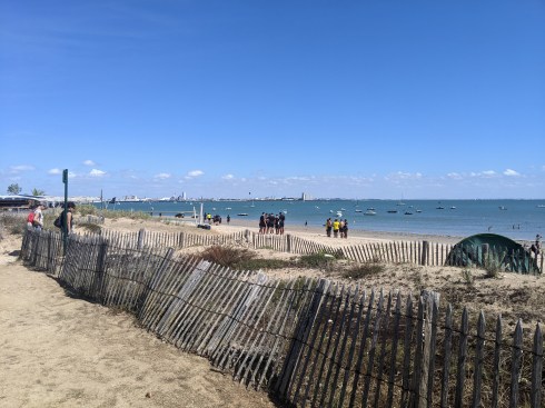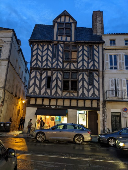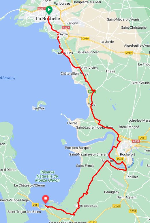 Ready for the day’s rideLa Mer, technically l’océan AtlantiqueThe two towers guarding once again against those pesky AnglosI walked 50m from our apartment to my favourite boulanger for a breakfast croissant and pain au chocolat and was besieged by a 5 minute downpourThere was a covered market nearby and oysters are the thing (and anything from the sea) in this areaThe place is jumping! All along the large harbour front it was packed with people, pubs, ice cream, oyster bars, and restaurantsThe view out to sea with the third tower and functioning lighthouseArt in the harbour with a “black sun”Just another bad selfie with the “Chain tower” and the “Saint Nicholas tower” helping out The “Lantern tower”, still useful as a lightouseYarn bombed bikes evenPug resemblent (by that I mean ugly, no offense to the dog) all electric CitroenIn the old town most walkways were arcaded, a sign the place had money as it was constructedA half-timbered house from the middle ages hosting a Poke restaurant, also a thing around AquitaineWe have eaten our share of the delicious melons from the Charente area, for good reasonHeading over to the île de Ré we had another 5 minute shower so we dived under a tree. Crossing to the island is via a 3km long bridge with a separated bike lanePort of La Flotte on the île de RéHarvesting salt has been an industry for centuries, and the area has many salt marshesA beach on île de Ré complete with all manner of the latest wind powered craftOn our last evening promenade in La Rochelle we noticed all the birds congregating on the clock tower, one of the city gates