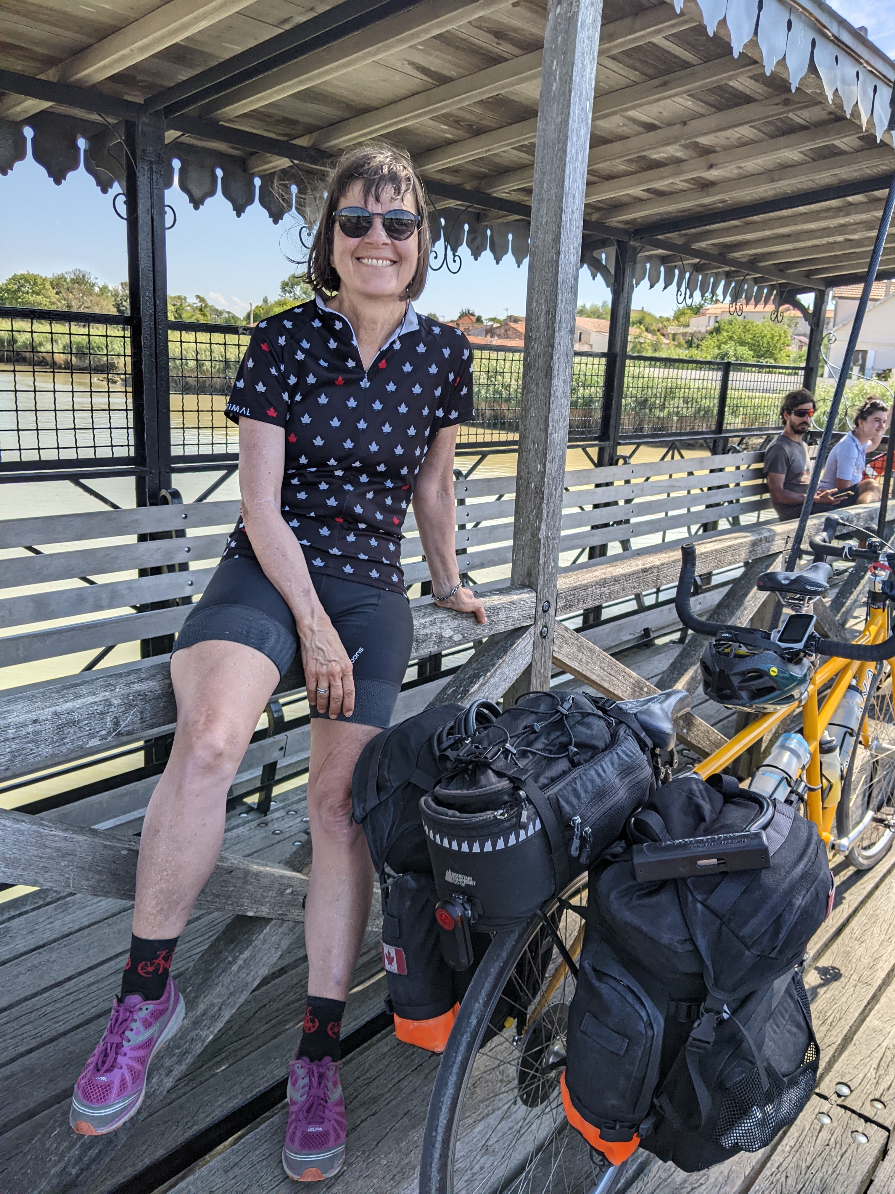 This time we crossed the Charente River on the easier bridge, the Transbordeur. It was recently reopened after 4 years of renovation. We arrived there about 1pm but the 2 staff members were having their “dejeuner” so we had to wait an hour to cross. It was interesting to see all the different cyclists gathering here with us to wait. There was no signage about this midday rest, instead the operator had to keep telling people from his lunch table that he would start again at 2pm, it seemed odd, another strange French thing.