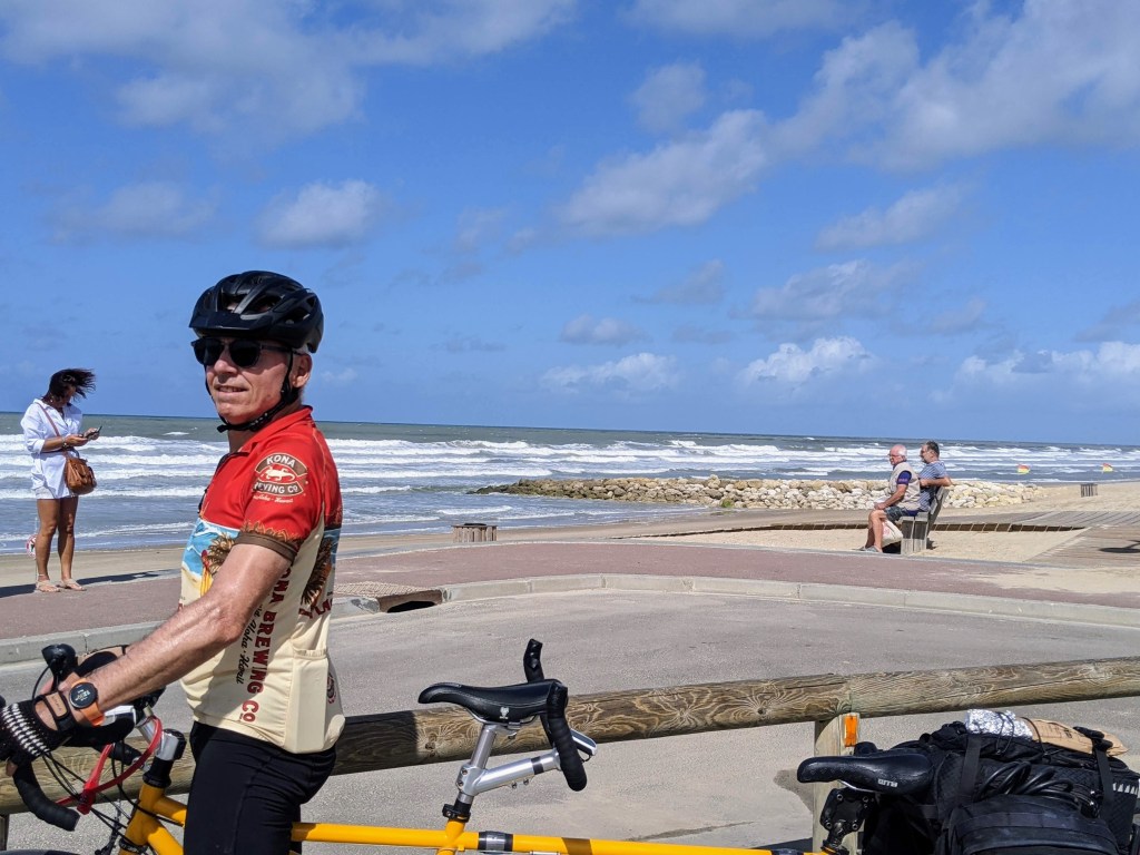 Most of the route today was through forested areas and some right against the Atlantic ocean. There are lots of sand dune areas and again huge beaches. Today was blustery and the water was wild with big waves. No swimmers seen but there were a few brave souls out kite surfing. A lot of the forests here are not natural, instead they have been planted in rows, quite funny looking. We have seen a few deer but nothing else. I don’t think there are bears here thankfully. We also see old bomb shelters and bunkers along the coast from WW2, more reminders of difficult times. It does put the Ukraine/Russia conflict into perspective.