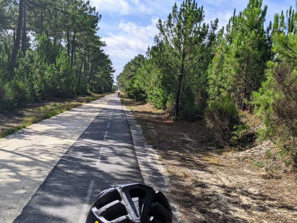 The ride followed the Velodyssey Atlantic for most of the way except the first 15 kms or so, but still a cycle track. The first 12 were on an old train bed turned bike path so was boringly straight and monotonous. By the end of this bit we both felt we had seen enough of these man-made row planted forests. We are lucky to have natural forests at home. Following that bit we were still in the forest but it was rolling and curvy often with intersecting paths that led from/to the ocean and sand dunes. At times the paths are pretty bumpy thanks to the tree roots so we had to keep the speed down a bit.