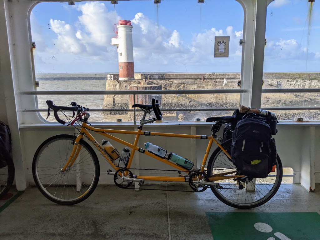 Anyway we made it to the ferry with almost an hour to spare which was good as it took time to figure out the tickets. This is a small boat, no cars but bikes are ok though not free, the tandem cost extra and we had to unload the panniers so it could be hoisted onto the boat.