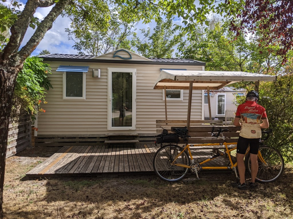 We are staying in a campground on Lac de Carcans-Hourtin for a couple of nights in a cute little camping cottage. This is the largest fresh water lake in France but not that big by Canadian standards. We had hoped to hope to do a little paddleboarding or some other lake activity but the weather didn’t co-operate. Instead we had another rest day and just wandered around the port and the town a bit. We saw some people kite surfing on the lake and some others learning some trick wakeboarding in a small pond being pulled by a mechanical tow rope.