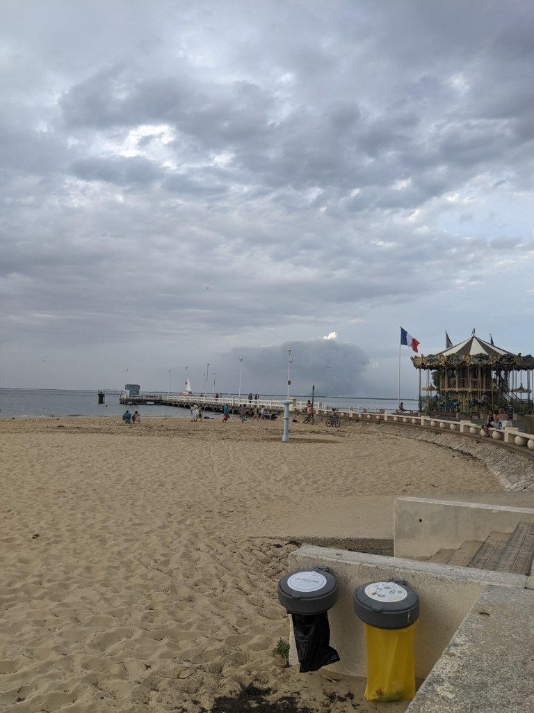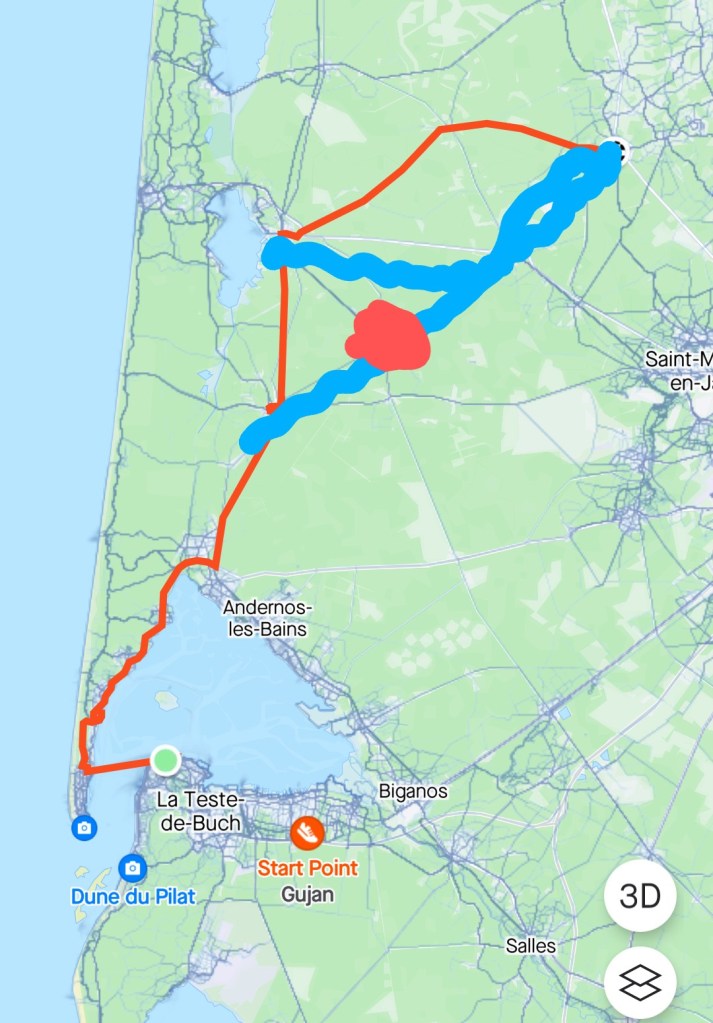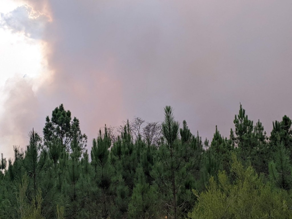 The ride today turned into somewhat of an adventure. We started late as we were sending Erika back to Bordeaux for her flight home and she didn’t leave until noon. We started with another ferry ride back over to Cap Ferret and onto the velodyssey route again. About 20 kms in we started to notice a big smoke plume ahead, something George had noticed the day before but didn’t think too much about. At 30kms we hit the first road block, spoke with the Gendarmes and were advised to go north around the wildfire. We got to the next town and again we were stopped by a road closure and had to head farther north to circumvent the trouble spot. This time we didn’t get stopped, we got through to our next destination but rode an extra 20kms in +30 degrees, arriving about 6pm rather than 4pm. This is one disadvantage to cycle touring, it’s not always easy to add on extra mileage. It was a bit smokey along the road but not too bad.