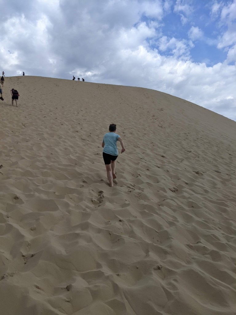 The next morning we rented a single bike and the 3 of us rode south of Arcachon to the Dune du Pilat, a huge sand dune area about 10 kms away. Erika wasn’t keen to ride the single bike so she went on the tandem with her dad and I rode the rental “comfort” bike. The sand dune was an amazing sight, as big as any we had seen before when crossing the Sahara desert. The view from the top of the Dune was spectacular! The day was quite hot, about 37 degrees, but a bit cloudy so that helped.