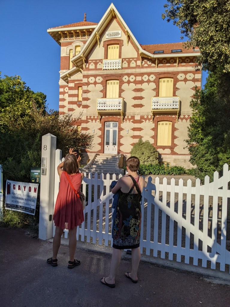 Late in the afternoon we did our evening promenade in the “winter village”. This is an exclusive area in Arcachon elevated above the city and basin lined with elaborate Belle Epoch style homes. Apparently they were built in the late 19th/early 20th centuries for wealthy families and their servants to live during the winter months while recuperating from tuberculosis.