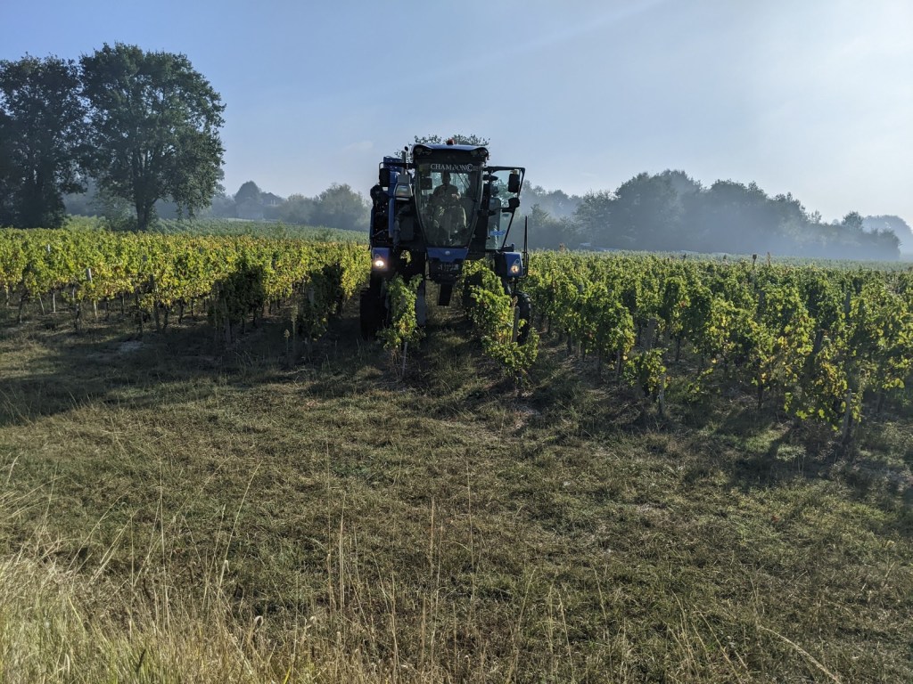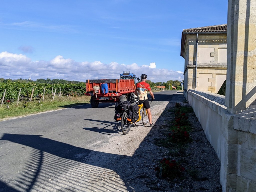 We can’t really visit the chateaux and do tasting when riding, we need our wits about us. The roads are fairly quiet but still some cars and many tractors around. It is harvest time so lots of activity and grape pickers. We have now seen many of the automated grape picking machines, very interesting to watch. They still require many grape pickers though. The older vines are too fragile and don’t recover as well from the automated pickers so harvest must be done by hand. We have seen huge numbers of what appears to be foreign workers speaking Spanish and other languages here to pick grapes. The are living in trailers and tent villages set up in empty fields or other spaces.