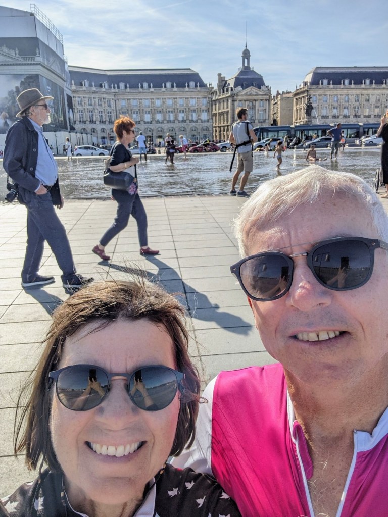 After hanging about on the busy Bordeaux waterfront, people watching and cooling our feet in the miroir d’eau we rode the final kilometer. We were welcomed back to the B&B where we began by our genial host, and where our bike case was waiting for us, a very comfortable lodging. Bordeaux seemed to be quite alive with people for a Sunday evening and we had no problem finding an open restaurant, in this case Moroccan for a couscous and tagine (and Moroccan wine).