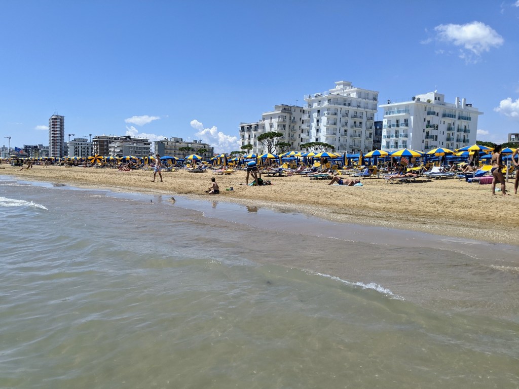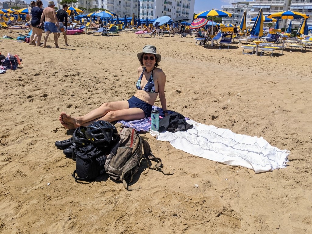 The lido is primarily a beachy place; it looks a lot like the Italian and French riviera with lots of ritzy hotels and beaches covered with rental chairs and parasols.  We took the short ride to the beach today and sat there for a short time on the small public area. Going to the beach with the bike is not the most convenient as you have to have your cycling gear on, bathing suit underneath, bring alternate footwear, towel, hat, etc then store/lock the bike and carry helmets/tech gadgets, bags, shoes/socks to where you’re sitting.  Once your’re done you have to get rid of all the sand, re-dress in the bike gear and shoes with a wet swimsuit on…(it’s worth it-GG) can you tell this isn’t my favourite way to do the beach?  We did treat ourselves to gelato at the end though.