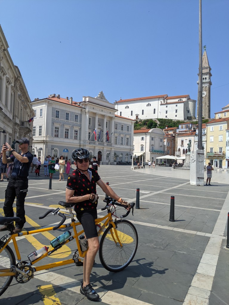 Our route went inland after Izola following a well established part of the Eurovelo 8 which is also part of the Parenzana trail of the Istrian Peninsula, formerly a rail line. Once in Portoroz we dumped our bags at the hostel and rode the short distance to Piran which is the coastal town at the end of this smaller peninsula. We found the beautiful main piazza in Piran and treated ourselves to some gelato, relaxation and people watching.