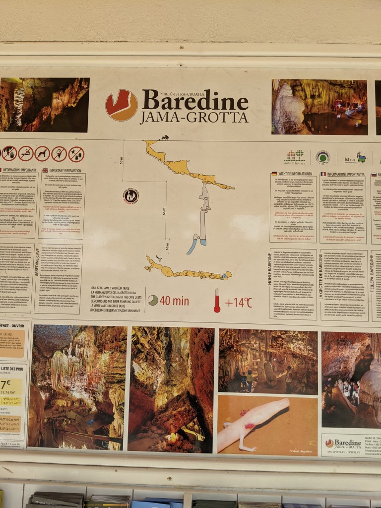 Our second day in Porec we rode a little way out of the city to the Baredine Cave for an underground tour. It was very pedestrian compared to the one we did with our son in law Ryan at the Rat’s Nest Cave in Canmore (rappelling and squeezing through tight spaces) but enjoyable nonetheless. We saw many beautiful stalagtites, stalagmites, crystals and even an endemic creature called a cave olm. There were 5 chambers to see and we were 60 meters underground. It was very refreshing to get out of the hot weather and into the cool 14 degree cave environment.
