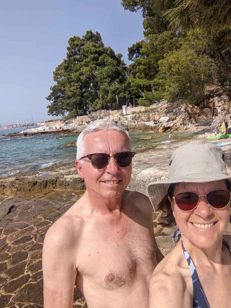 The next day and the next leg of the segment to Porec was very scenic but also very tiring as it involved more climbing, a considerable amount of gravel and getting a bit lost once or twice, things which impact our pace. The mileage didn’t seem too bad at 72 kms but took longer than usual so we arrived pretty bagged. However we are feeling stronger after a week of riding. We entered Croatia soon after leaving Portoroz and here too there are many separated bike lanes to make cycling more comfortable and again we were following some of the Parenzana trail. For the most part we were on coastal roads so passed through many beautiful ports and beachy areas. The weather was hot but the cool air off the water helped. All up and down this coast it is a giant seaside playground. Every bay and seaside village is busily helping the sun worshipping tourists to do their thing. Not just bars and restaurants but giant waterborne playgrounds, bike rentals by the hundreds, jet skis, para-sailing, and on and on. It makes it a bit crowded on the seaside trails but fun to watch too.