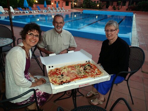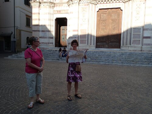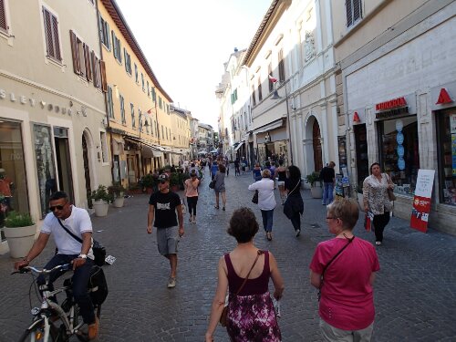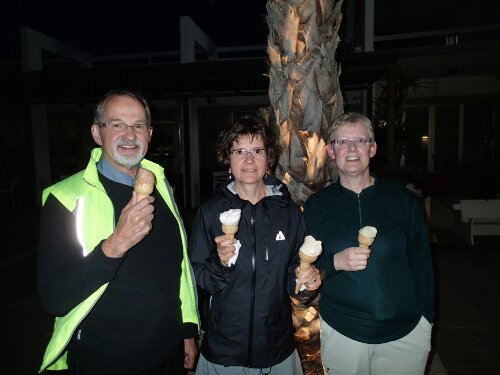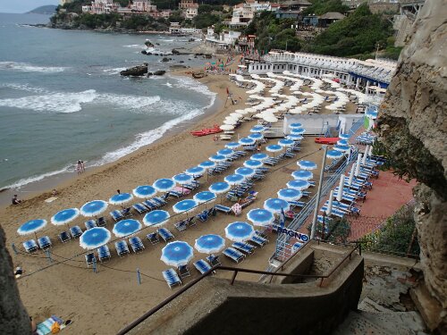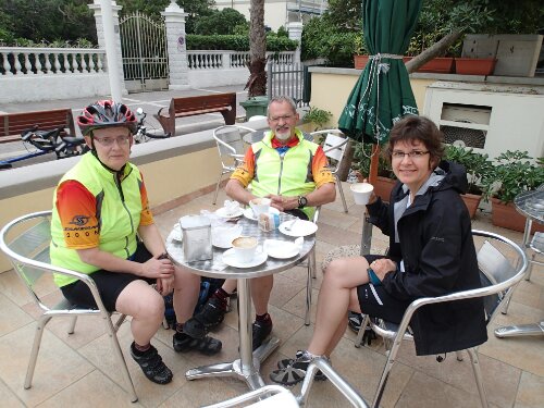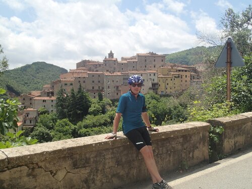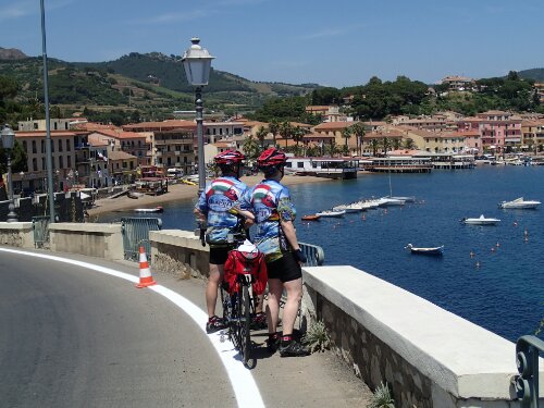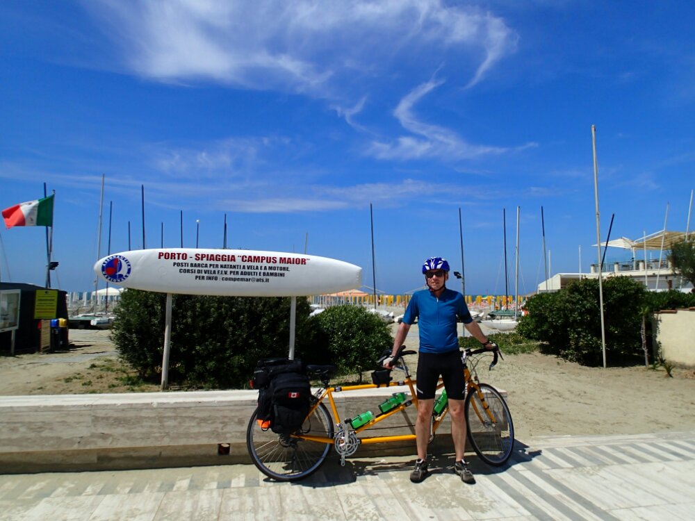We stayed last night in Grosseto at the B&B Ricasole run by a lovely woman named Fulvia who was a super hostess and really worked at making her B&B numero uno. She put on a great breakfast including of course coffee of your choosing but also homemade nutella tarts (not so good for Tara). Yummy, and great calories for burning on the bike. After all the kissing and hugging with Fulvia we were off headed back towards the sea and our last chance for topless sunbathing. After our little dialogue with the friendly Polizia yesterday we checked the preplanned route carefully to assure we would be travelling on legal roads for bicycles. As a result we were in for some climbing on the small roads which generally have many rewards like the best views, the least traffic, and making great big muscles. Montiano was the literal high point today, its name being a clue to its altitude. A lot of water was consumed throughout the day as 30 degrees is now becoming the norm for temperature. Lunch was a simple roadside stop under trees for shade as the seaside was still 20km away. Apart from the mountain, the ride through the country was quite relaxed and beautiful, scooting by olive groves, grapes, and a lot of tomato plants. Our destination is an interesting bit of geography, consisting of the island of Argentario but connected to the mainland by three narrow isthmus(es), one of which has the town of Orbetello, and our hotel. We walked into the old part of town for the requisite gelato and beer after a hot and pseudo-demanding day’s ride. First impression was it wasn’t that pretty and not what we expected for a seaside stop, but the beer was still cold. Supper turned out to be a treat as we hunted down tripadvisor’s no.1 rated Orbetello restaurant. More than the typical italian fare, it had splashes of international flavours such as curry. I had some grilled tuna which the owner and I had a very enthusiastic conversation about. It was as if he knew the fish personally as it was caught and flash frozen recently off of Sicily. Great fun.