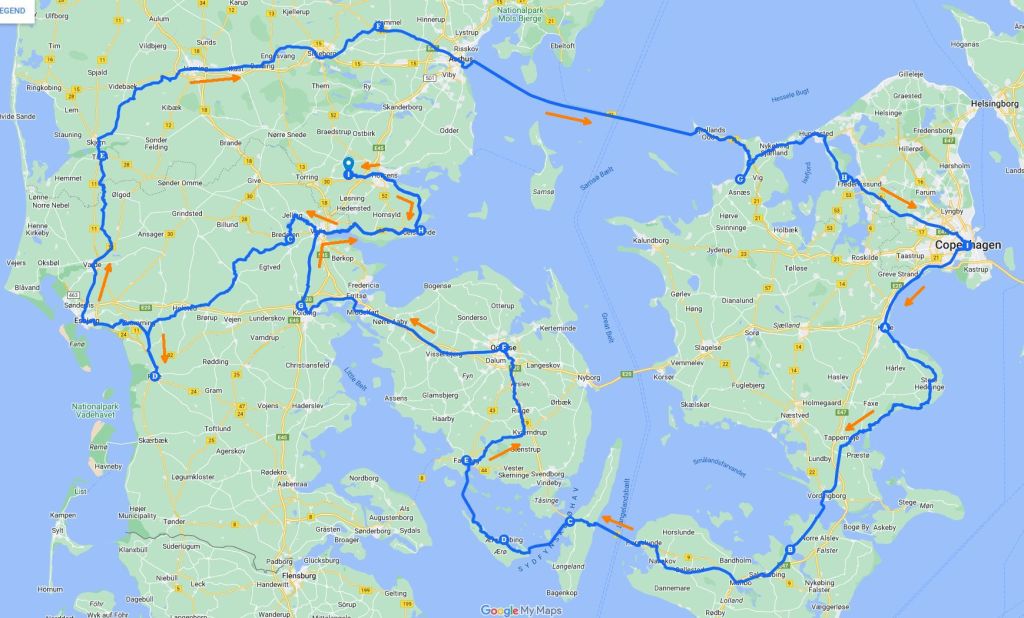 We flew first to London and spent a couple days with our daughter Erika before arriving at Billund Airport. We arrived to a greeting party (thank you Erik, Mie, and Ida) and 2 cars to transport us to our first stop at cousin Aksel and Birgit’s home close to Hornborg. Usually we arrive with bike box and luggage and search to find the correct train or bus in a foreign city so it was a treat. We spent 2 days around there, also visiting Vejle, before actually getting on the bike. The pace is a bit more relaxed, at least to start.
