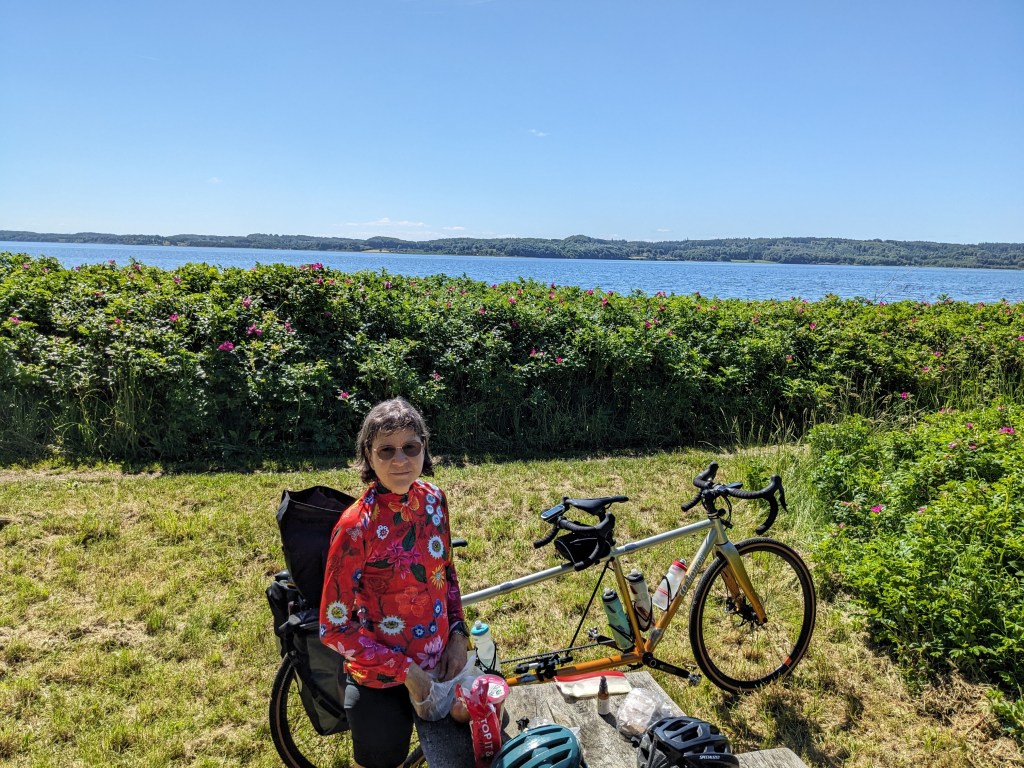 Checking the map to assure we stay on the right side of the dikeWest coast sheep with Esbjerg in the backgroundWho’s lunch is whose do you think?Just outside of Esbjerg with four men looking out to seaA short nap on the west coastHappy to finally see the west coast (and the sun)Look, bikes get elevators here!Tara was excited to see hand sanitizer right on the table. Great little restaurant too (Hos Ingeborg, Esbjerg)Just your average cycling superhighway alongside the roadBad selfie at Hvide Sande (featured in a Danish crime series) with cousin Aage, Gitte, and us.Waves and wind toys and a lot of white sandToes only, yikes!Ines liked our bike, such a sweetheart!Lunch near Silkeborg with Birgit, Niels, and AndreasAlmost the highest hill in Denmark with Niels explainingThe Rainbow Panorama at ARoS is a unique and fabulous featureRainbow selfieARoS was exhibiting Ron Mueck’s “Girl 2006”, a super-size true to life depictionNext to see was Moesgaard Natural History Museum, intriguing from outside and insideBirgit with her own sculpture “Bench Biter”The Katniss benchKatniss has fewer than nine lives after walking with us along the road for 4kmBirgit, Alexander, Jacob, and TaraFarvel to Birgit and family in HammelCousin Karin and Jacob welcomed us warmly to stay a night in the “kolonihave”Karin took some beautiful photos on the way outFerry number 1 of many, this one from Aarhus to Sjællands OddeAksel and I on a windy beach in Høve StrandThe ladies of the beachWe’ve seen a few buildings with things growing on the roof. No goats yet though.Mad (food) and Hygge, which is now almost in the Canadian vocabulary. Cherries right from the tree, with Aksel and BirgitShorter ferry from Rørvig to HundestedIt’s not hot but the “world’s best is (ice cream)” can easily go down. With Anker and Anne.While following a detour due to the ferry outage we had to hide from a stormIt was a fierce day getting to København but we seem to be up to the challengeLayers of dirt and stinging nettles