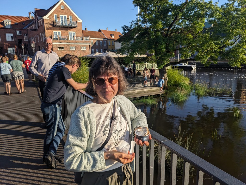 From Kolding we rode back to Juelsminde on a beautiful sunny day, now nearing the end of our tour and returning to cousin Poul and Anette’s lovely summer house. We also managed to get in a visit with Rita, George’s late Uncle Thue’s wife. George had to use his good Danish which he’s been busy practicing during the tour as none of the younger generation was there to help translate. We also saw our friend Anker again and his two sons Mikkel and Ulrich. They happened to be touring around the area and stopped by Rita’s for a visit, coincidentally, while we were there. We finished the day with a dip in the sea, finally a day nice enough to go for a swim. The water was fresh for sure but the sun warmed us quickly. We had a nice walk and some good Danish ice cream at the Juelsminde harbour.