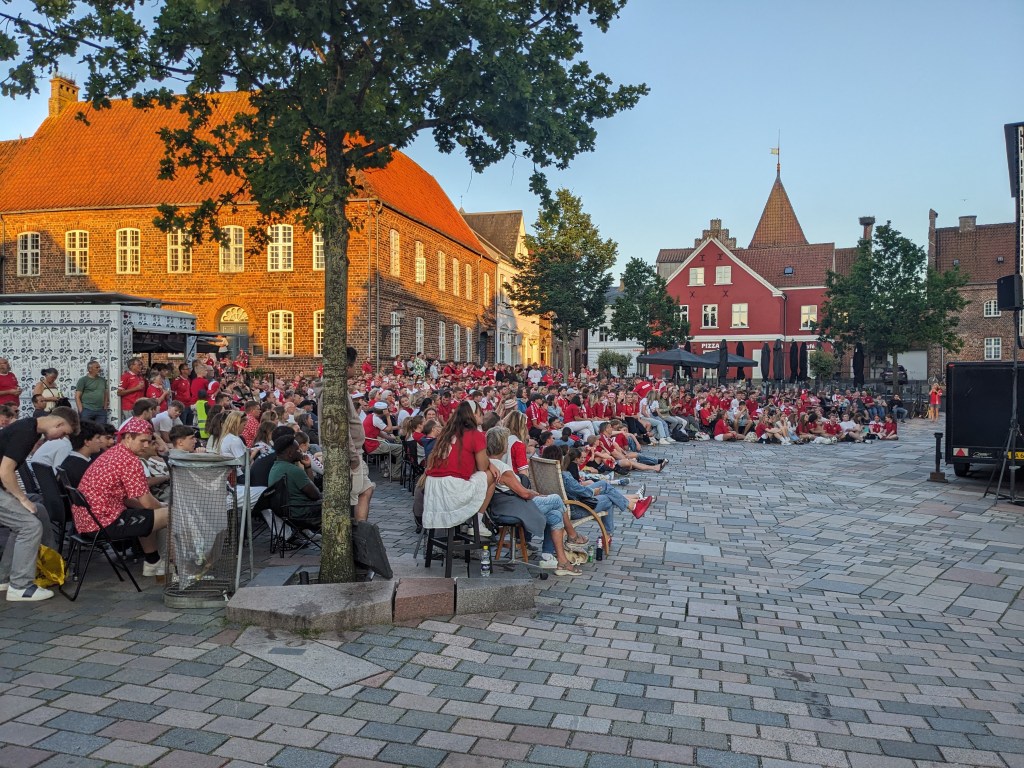 Our 3rd ride was to Ribe, on the southwest coast of Jutland. There are no relatives in Ribe unfortunately but we chose to come here as it is said to be the oldest city in Denmark. It is a lovely place with cobbled streets, historic buildings, a moat, a famous church, museums and many old stories about pirates and witches. We enjoyed a relaxing day off the bike resting our sore muscles and derrieres, enjoying this lovely historic spot. Our trip is at the same time as the UEFA Euro Cup for football (soccer) so when the Danes play it is unavoidable. There was a giant screen set up in the center so George went to watch too, proudly wearing his Danish football jersey. Also today George got to enjoy his first rød pølse amongst other typical Danish dishes we are finding to eat. In the evening, which goes very late since we are far north and at midsommer, we followed the ‘night watchman’ around the old town. It is a very old tradition for the watchman to keep an eye open for fires, floods, or people up to no good all night long. Our watchman told interesting historic tales and sang songs as we followed him around. Oh, and as for the weather it has been nearly perfect.